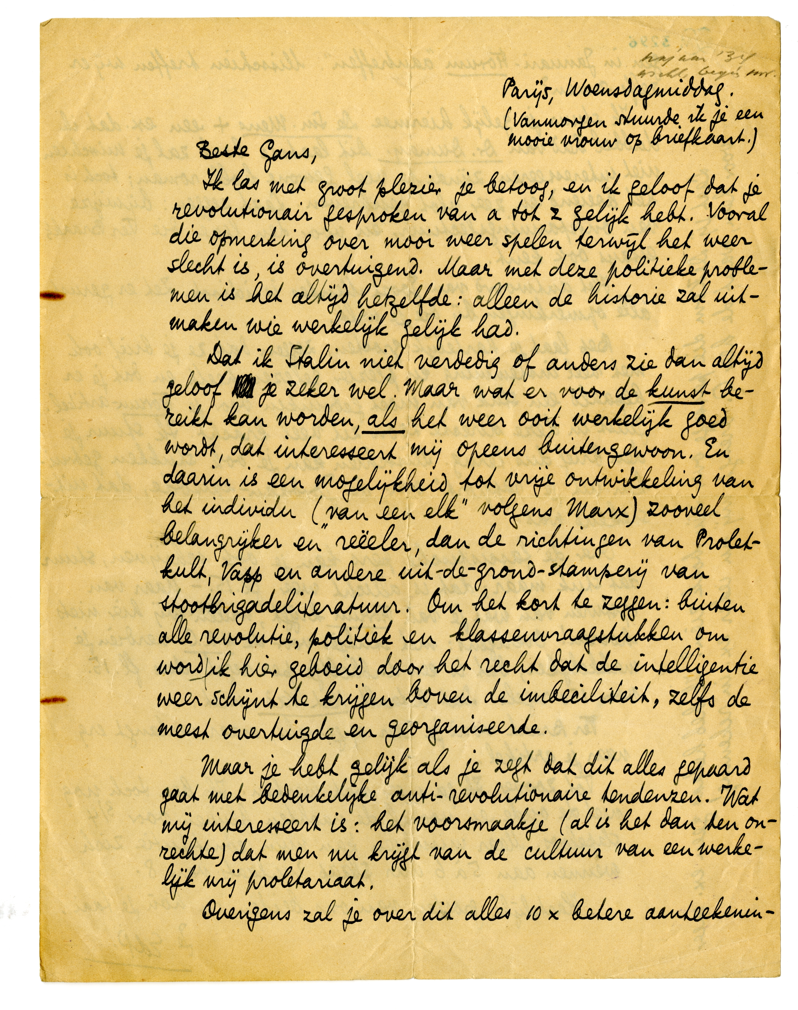 Dat ik Stalin niet verdedig of anders zie dan altijd geloof je zeker wel. Maar wat er voor de kunst bereikt kan worden, als het weer ooit werkelijk goed wordt, dat interesseert mij opeens buitengewoon. En daarin is een mogelijkheid tot vrije ontwikkeling van het individu (‘van een elk’ volgens Marx) zooveel belangrijker en reëeler, dan de richtingen van Prolet-kult,92 Vapp93 en andere uit-de-grond-stamperij van stootbrigadeliteratuur. Om het kort te zeggen: buken alle revolutie, politiek en klassenvraagstukken om word ik hier geboeid door het recht dat de intelligentie weer schijnt te krijgen boven de imbeciliteit, zelfs de meest overtuigde en georganiseerde.