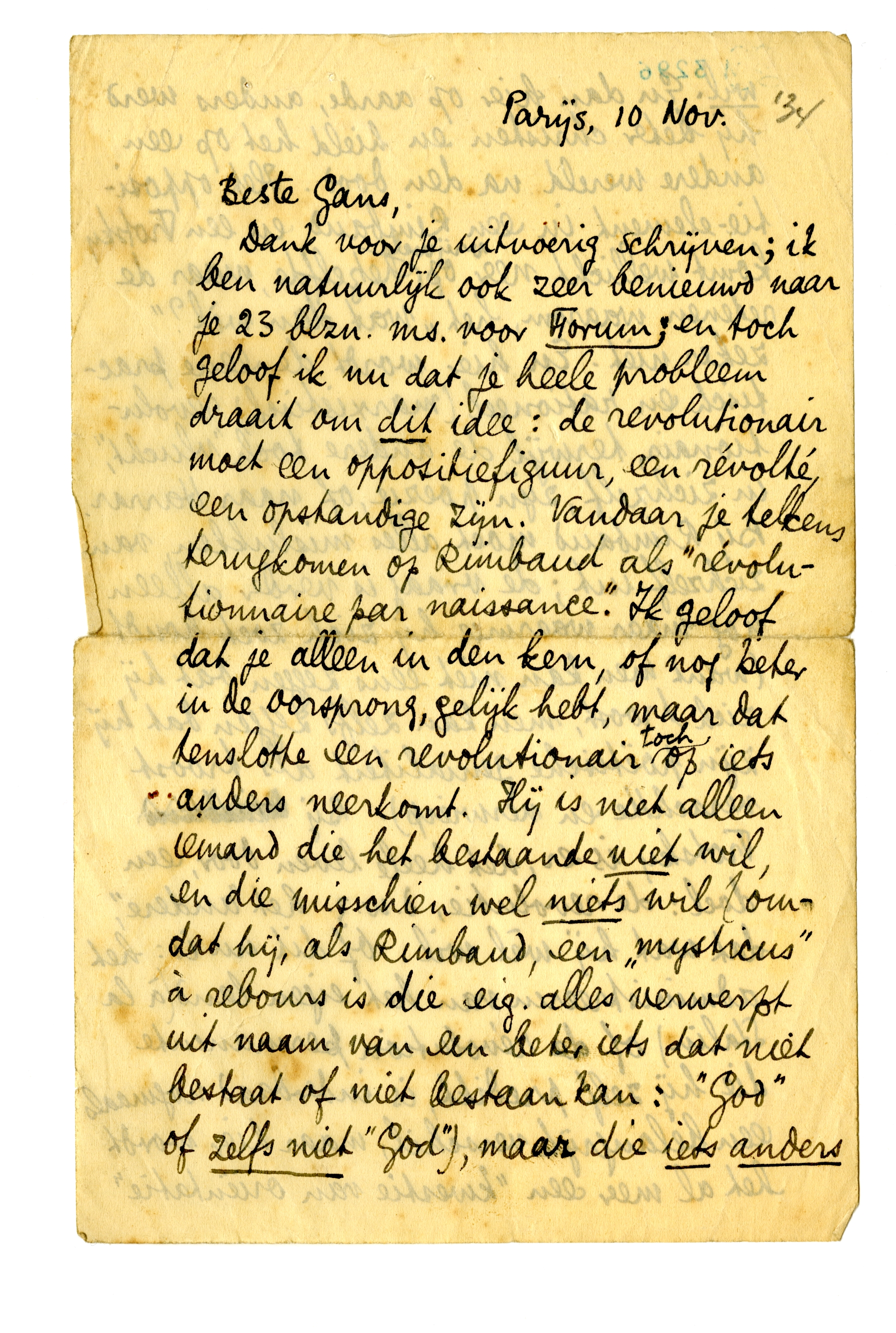 Dank voor je uitvoerig schrijven; ik ben natuurlijk ook zeer benieuwd naar je 23 blzn. ms. voor Forum: en toch geloof ik nu dat je heele probleem draait om dit idee: de revolutionair moet een oppositiefiguur, een révolté, een opstandige zijn. Vandaar je telkens terugkomen op Rimbaud als ‘révolutionnaire par naissance’. Ik geloof dat je alleen in den kern, of noch beter in de oorsprong, gelijk hebt, maar dat tenslotte een revolutionair toch op iets anders neerkomt. Hij is niet alleen iemand die het bestaande niet wil, en die misschien wel niets wil (omdat hij, als Rimbaud, een ‘mysticus’ à rebours is die eig. alles verwerpt uit naam van een beter iets dat niet bestaat of bestaan kan: ‘God’ of zelfs niet ‘God’), maar die iets anders wil. En dan hier op aarde, anders werd hij beter christen en hield het op een andere wereld na den dood.
