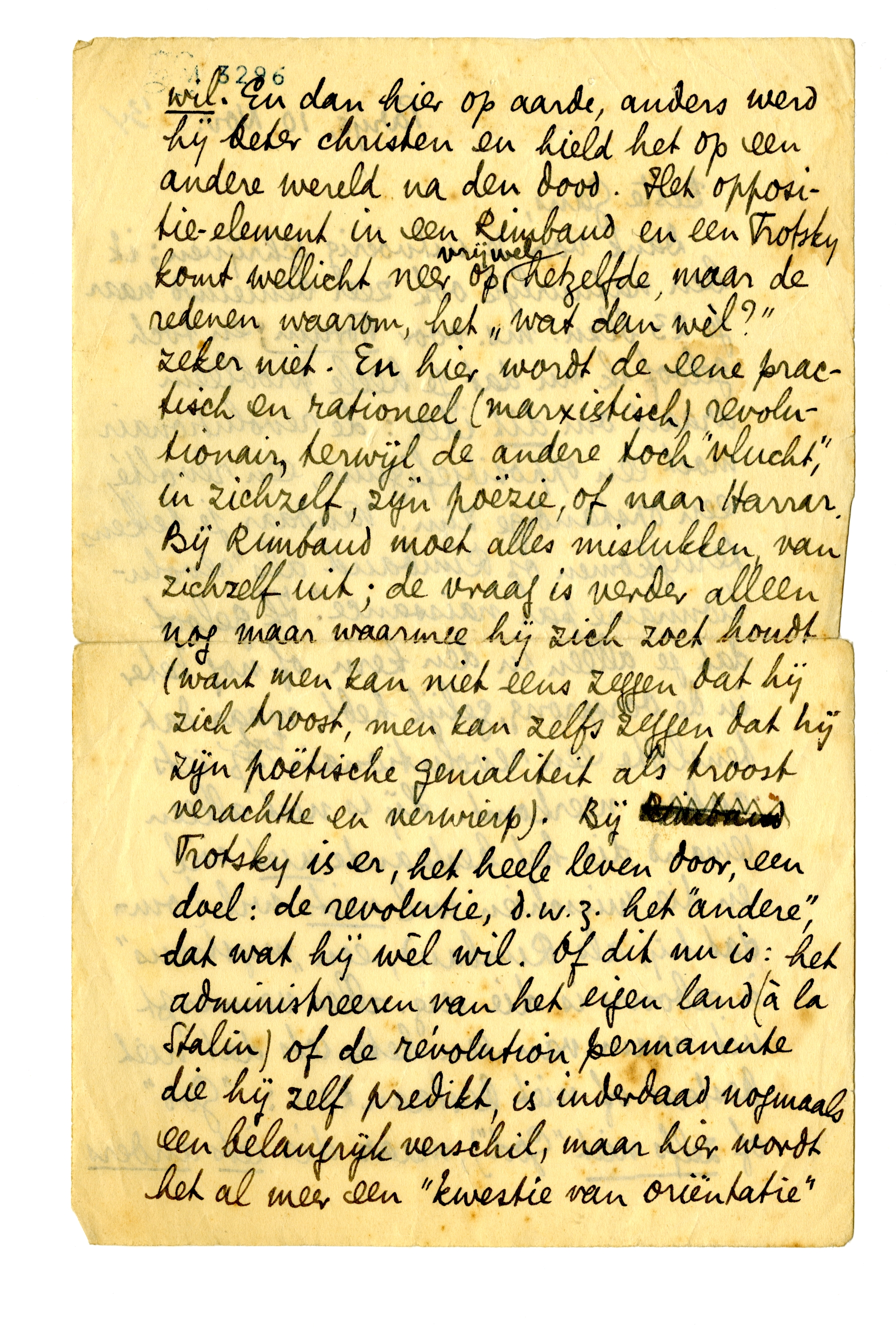 Het oppositie-element in een Rimbaud en een Trotsky komt wellicht neer op vrijwel hetzelfde, maar de redenen waarom, het ‘wat dan wèl?’ zeker niet. En hier wordt de eene practisch en rationeel (marxistisch) revolutionair, terwijl de andere toch ‘vlucht’, in zichzelf, zijn poëzie, of naar Harrar102. Bij Rimbaud moet alles mislukken, van zichzelf uit; de vraag is verder alleen nog maar waarmee hij zich zoet houdt (want men kan niet eens zeggen dat hij zich troost, men kan zelfs zeggen dat hij zijn poëtische genialiteit als troost verachtte en verwierp). Bij Trotsky is er, het heele leven door, een doel: de revolutie, d.w.z. het ‘andere’, dat wat hij wèl wil. Of dit nu is: het administreeren van het eigen land (à la Stalin) of de révolution permanente die hij zelf predikt, is inderdaad nogmaals een belangrijk verschil, maar hier wordt het al meer een ‘kwestie van oriëntatie’ zooals jijzelf zegt, en in ieder geval is het verschil minder groot dan met Rimbaud die zijn revolutionairschap toch verwaarloosde, ook als hij ermee geboren werd. Er zijn révoltés die het brengen tot burgerlijke kritici, kankeraars en andere malcontenten. Ik ben er volstrekt niet zeker van dat ik tenslotte niet daartoe behoor. Ik heb betere redenen op te geven, als ik ‘neen’ zeg tegen de politiek, waar een partij kiezen, ook voor de revolutie, op neerkomt: b.v. wat jij kinderziekte noemt en wat bestaat uit afkeer van allerlei ‘kameraden’ in hun reëele optreden. Maar dit maakt van mij toch ook weer niet een revolutionair! Die kameraden en beroepsrevolutionairen kunnen zich zoo gedragen, dat jij terecht van nieuwe burgers, ambtenaartjes, bureaucraten, etc. spreekt. Maar dit maakt mij, of mijn houding, van den weeromstuit, nog niet revolutionair! Pas op voor je sympathie en dégoût in dergelijke definities! Je vindt mij sympathieker dan Last en voelt je meer ‘verwant’ aan mij dan aan hem. Maar objectief gesproken wordt het een zeer zwak argument als je zegt: Last is een neo-bourgeois en (dus?) du Perron ‘een revolutionair’.