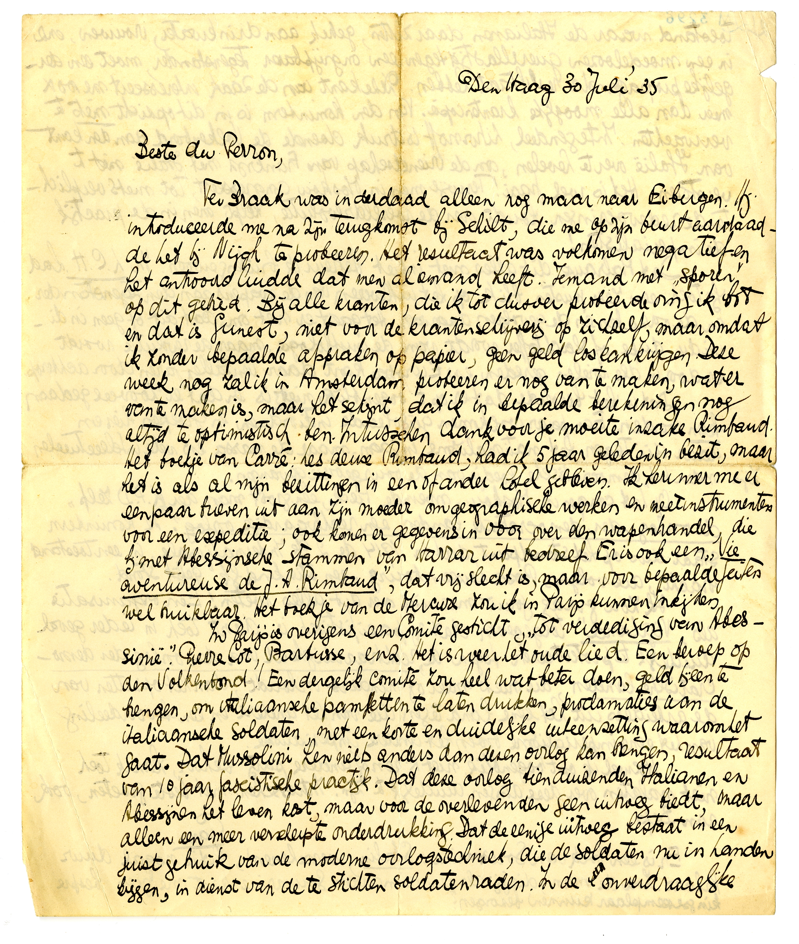 In Parijs is overigens een Comité gesticht ‘tot verdediging van Abessinië’. Pierre Lot, Bartusse,135 enz. Het is weer het oude lied. Een beroep op den Volkenbond! Een dergelijk comité zou heel wat beter doen, geld bijeen te brengen, om italiaansche pamfletten te laten drukken, proclamaties aan de italiaansche soldaten, met een korte en duidelijke uiteenzetting waarom het gaat. Dat Mussolini hen niets anders dan dezen oorlog kan brengen, resultaat van 10 jaar fascistische practijk. Dat deze oorlog tienduizenden Italianen en Abessijnen het leven kost, maar voor de overlevenden geen uitweg biedt, maar alleen een meer verscherpte onderdrukking. Dat de eenige uitweg bestaat in een juist gebruik van de moderne oorlogstechniek, die de soldaten nu in handen krijgen, in dienst van de te stichten soldatenraden. In de onverdraaglijke toestand waar de Italianen daar zitten, gebrek aan drinkwater, vrouwen, enz. in een moedeloozen guerillastrijd tegen een ongrijpbaren tegenstander, moet een dergelijke propaganda resultaat hebben. Deze kant van de zaak interesseert me 100 x meer dan alle mooglijke krantencopie. Van den Komintern is in dit opzicht niets te verwachten. Integendeel, Litvinoff136 is druk doende de Volkenbond aan den kant van Italië over te hevelen, om de vriendschap van Frankrijk met Italië niet te verstoren. Het is wel fraai! Terwijl men in Moskou congresseert, tot niets verplichtende redevoeringen houdt over de wereldrevolutie, helpt men in de practijk de imperialisten!